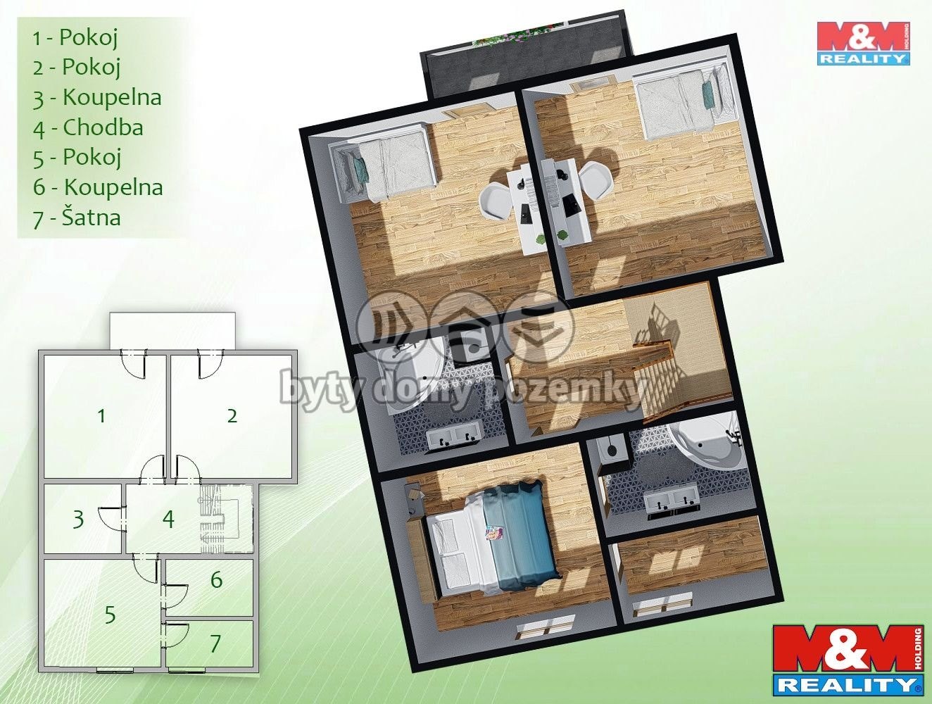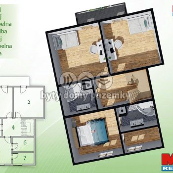| Zařízení nemovitosti | Lednička, Kuchyňská linka, Pračka, Sporák, Postel, Sedačka, Skříně |